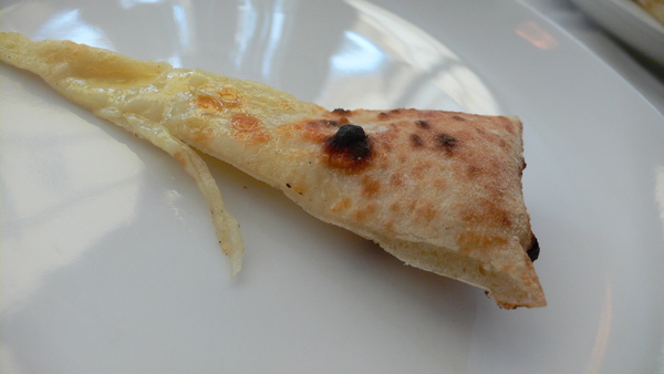 *Primo的餅皮有拿玻里披薩特色的cornicione,相對於羅馬式薄餅皮(Sabatini和西華Toscana)的酥脆,它更加Q軟,嚼得出麵粉的香甜。如果是冷凍麵糰烤出來的披薩,cornicione的口感會更緊實、甚至有點像麻糬。上面的黑點點,據我當廚師的大姊解釋,可能是因為酵母發酵有糖份,比較容易焦掉的關係。