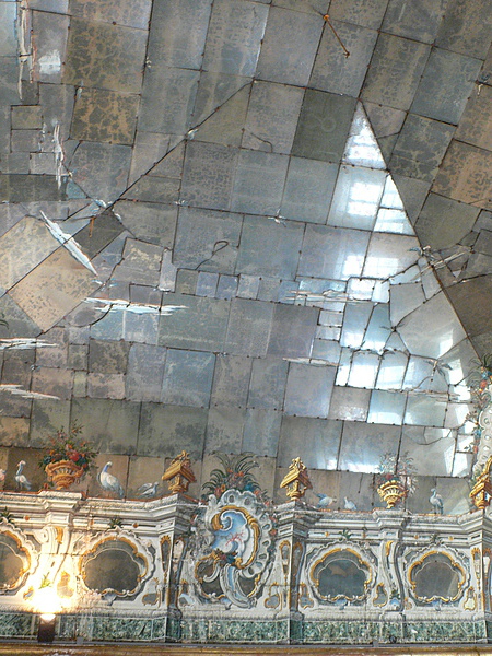 別墅的內外裝潢,完全可以看出一個人在瀕臨崩困前的心理狀態。圍牆上各種古怪的人獸雕像,三奶怪、五眼怪、人面驢身、庭院裡散落著斷腿像臥佛的人像...金黃色的砂岩因為風雨摧殘變成斑駁的黑色。別墅的中央則是宴會大廳,上頭的鏡子據說源自於王子的特殊癖好,好觀賞賓客翩翩起舞的姿態。